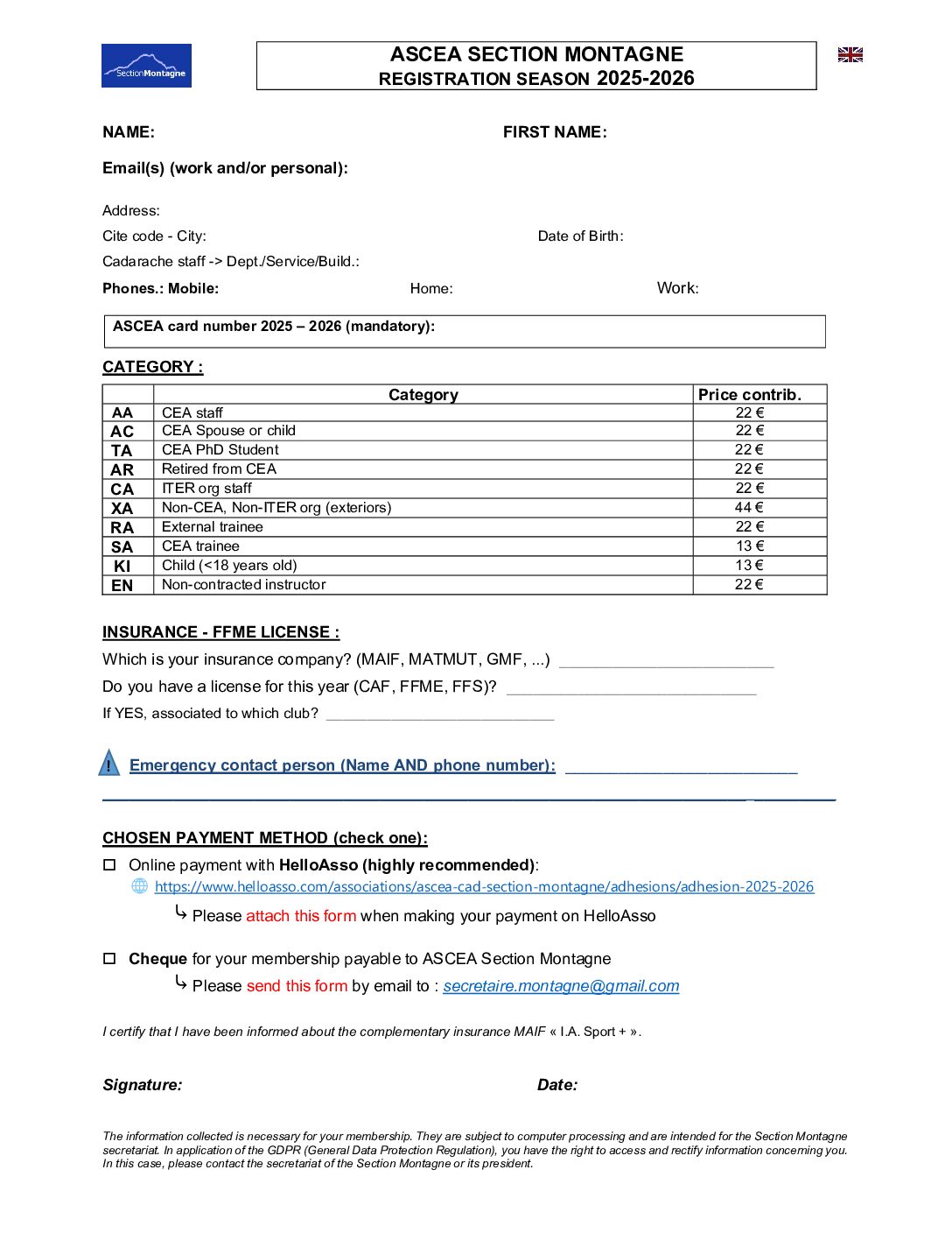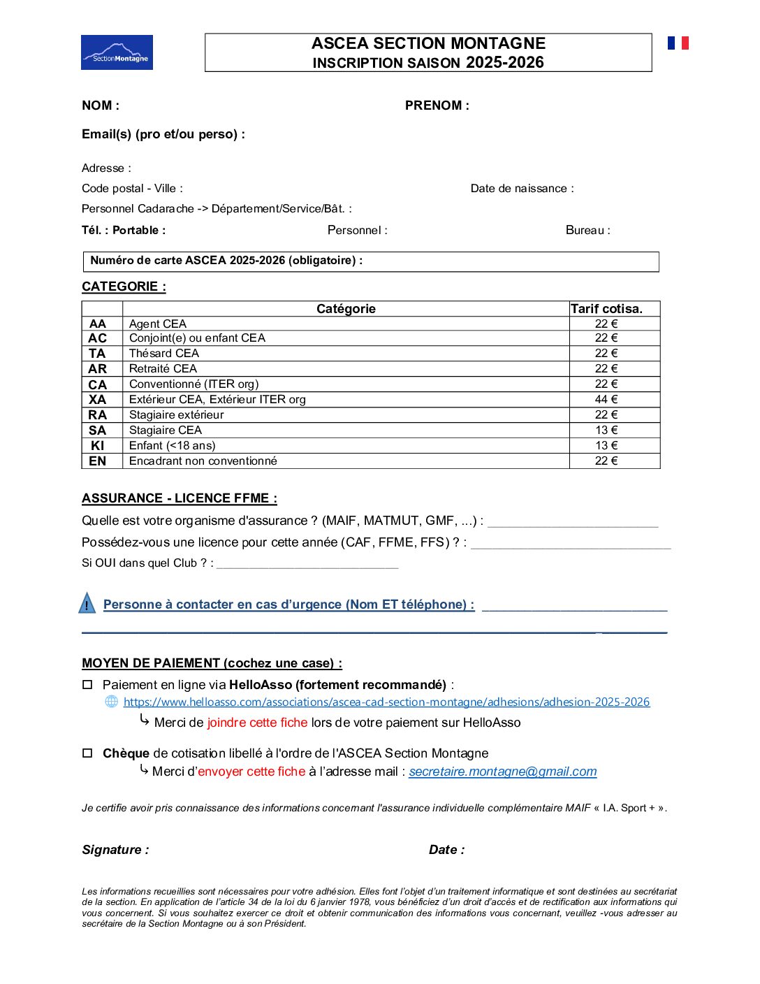 1. Adhésion à l’ASCEA Cadarache nécessaire pour pouvoir s’inscrire dans les sections : bulletin d’adhesion ASCEA Cadarache