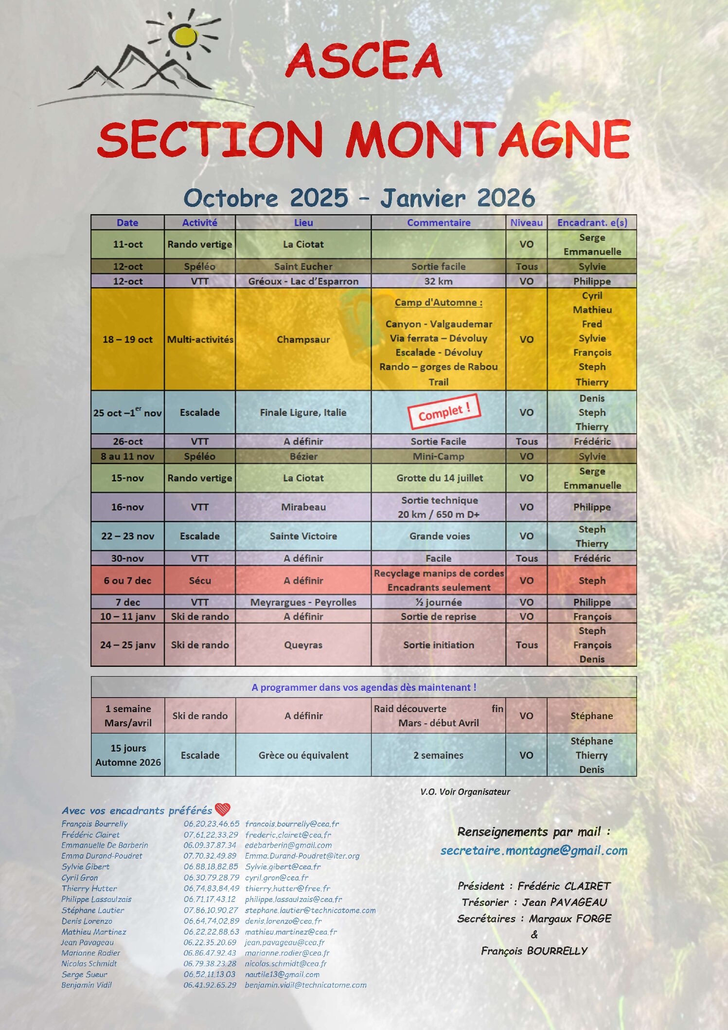 La montagne, des belles falaises blanches de nos magiques calanques aux sommets enneigés autrichiens, notre terrain de jeu est grandiose. Il s’agit d’un milieu naturel à respecter, bien sur. Pour en profiter dans les meilleures conditions de plaisir et de sécurité, beaucoup de techniques et de savoir faire sont nécessaires à nos encadrants. Pour cela, ils participent à des stages de formation, de perfectionnement et de sécurité organisés par la Fédération Française de Montagne et d’Escalade. Cet engagement est vital pour qu’une section montagne continue d’exister au sein de l’AS. Ce sont donc bien les encadrants qu’il faut remercier vivement et chaleureusement de tout le temps et l’énergie qu’ils consacrent non seulement à l’organisation des sorties, mais aussi à leurs formations.
